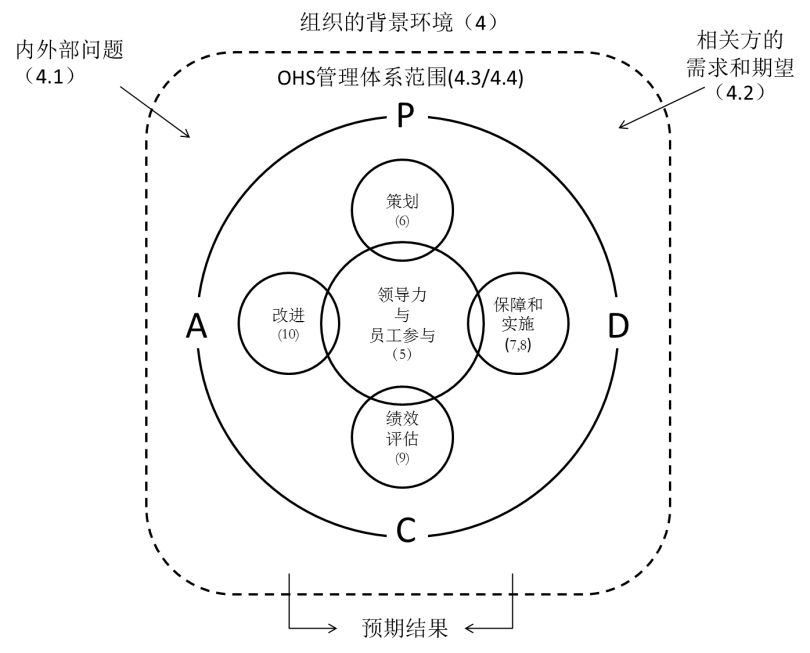 安全管理体系是企业安全组织制度和企业安全管理制度的总称,依据ISO45001框架建立的安全管理体系框架,以“领导力与员工参与”为驱动力,结合PDCA闭环管理概念组成。包括以下5个方面: